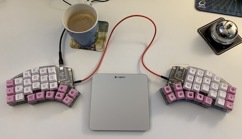 J'ai un collègue qui a laissé traîner un de ses claviers mécanique custom en split keyboard dans le fablab à l'agence, et qui a accepté de me le prêter pour que joue un peu avec pour voir si ça me donne envie et pour explorer cet écosystème un peu particulier où des personnes qui développement du "firmware" pour leur clavier...