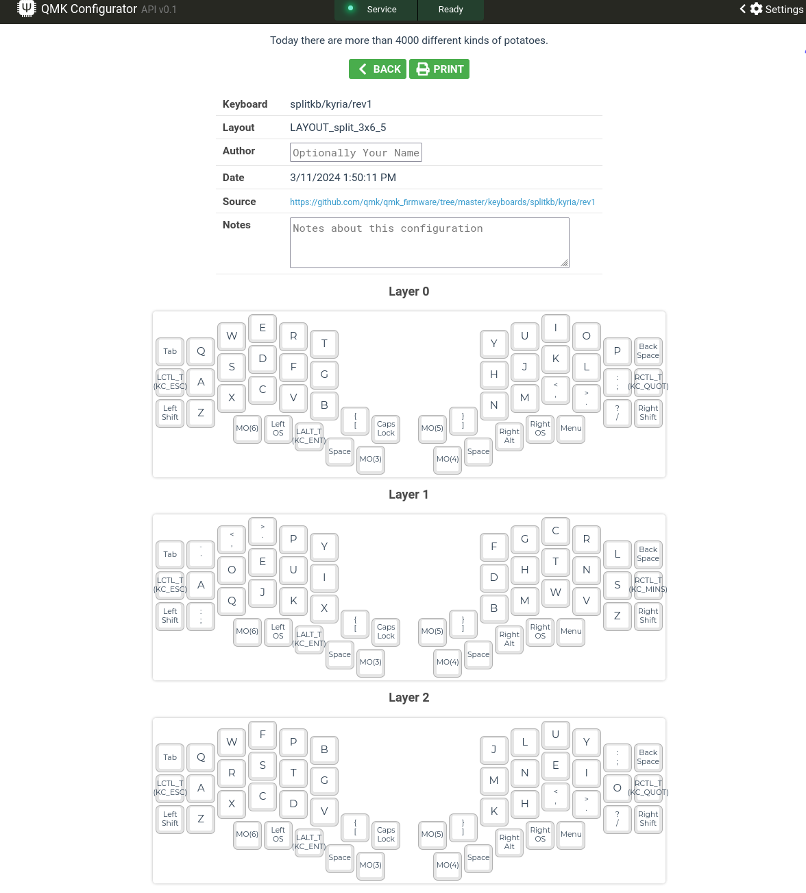 🖨 QMK Configurator est une ressource précieuse, on peut aussi y imprimer les layout / layers. Avant de configurer un truc à ma sauce, faut comprendre le layout par défaut. Une bonne documentation papier...