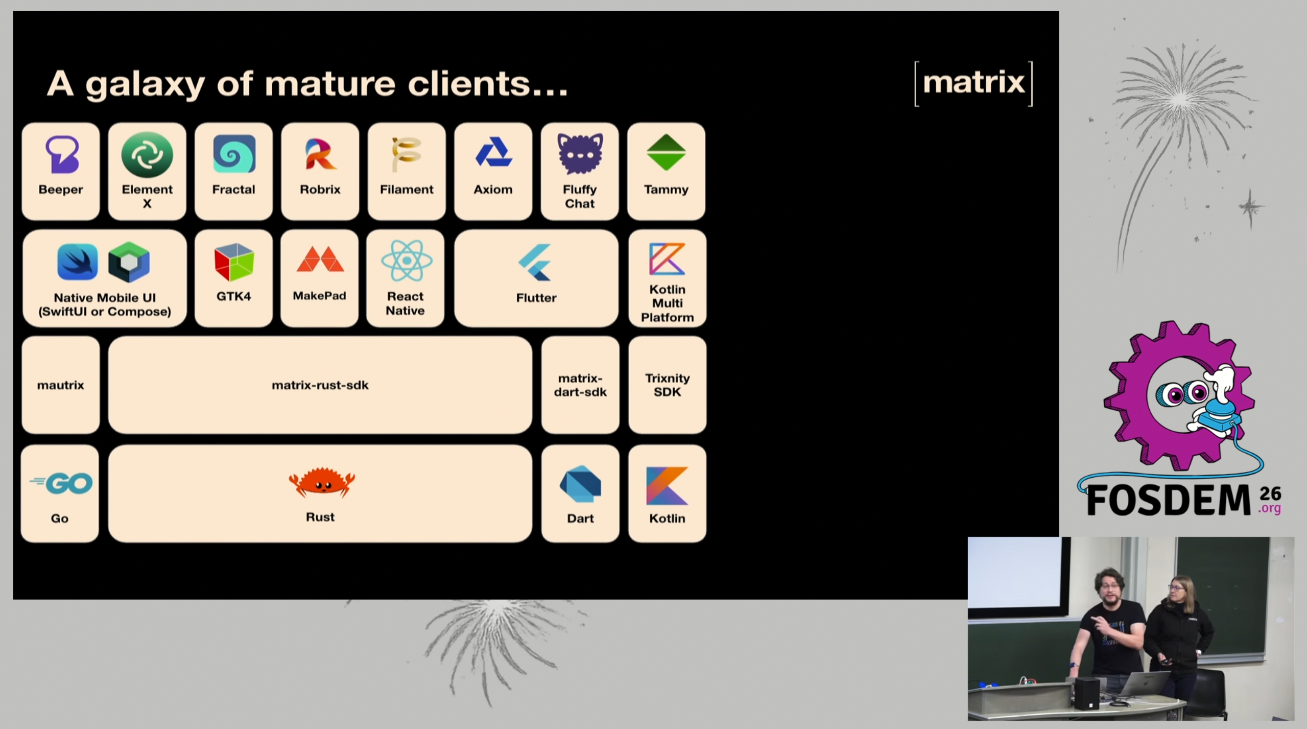 Dimanche matin, je me suis calé dans la salle Matrix/XMPP et c'était à nouveau passionnant. L’écosystème autour de Matrix, que j'ai commencé à explorer il y a quelques années en installant des serveurs Matrix pour remplacer une infrastructure XMPP dans ma boîte précédente, continue de mûrir au fil des ans. Dans le "Matrix State of the Union", ils témoignent du fait que, au vu des récentes problématiques géopolitiques avec les USA et donc les GAFAM, le discours sur la maîtrise des moyens de communication avec des outils tels que Matrix trouve un écho beaucoup plus rapide et éclairé qu'il y a quelques années.