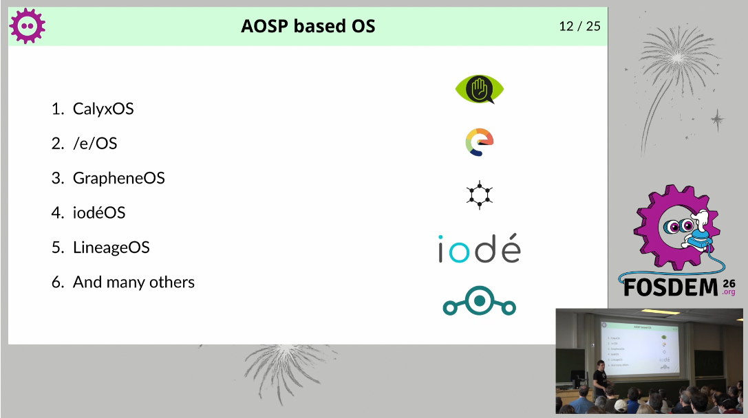 Pour bien commencer la conférence, je suis allé passer du temps dans la salle sur les écosystèmes open free and open source pour le mobile. Il y avait nombre de projets que j'utilise ou auxquels je participe modestement : Android, AOSP (Android Open Source Project), lineageOS, postmarketOS, F-Droid, SailfishOS, Murena et /e/OS, etc.